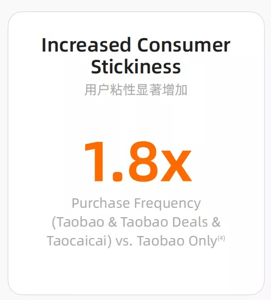 且用户在使用了淘特和淘菜菜后,他们在整个阿里中国零售商业中的购物频次大幅增加,同时使用淘宝、淘特和淘菜菜的用户的购物频率是仅使用淘宝的用户的1.8倍。