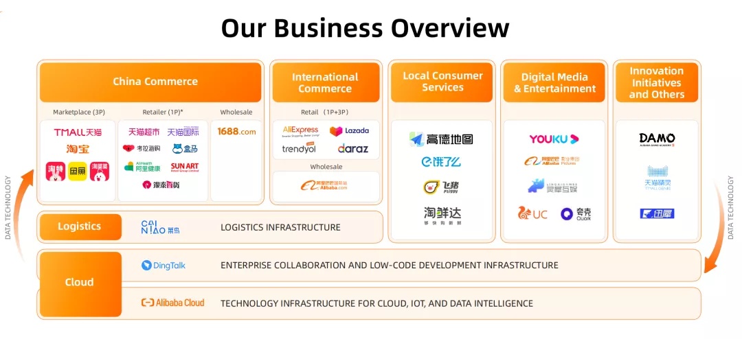 简单划分,可以分为中国商业、国际电商、本地生活、数字娱乐、创新业务、菜鸟网络和阿里云。