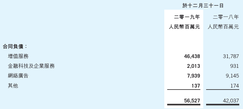 从2018年开始,腾讯在年度报告当中披露“递延收入”的具体来源(但是在中报、季报当中没有这样的披露)。2019年底,腾讯“递延收入”绝大部分是“合同负债”,即客户已经付费、但是尚未确认收入的项目。在“合同负债”当中,超过80%来自增值服务业务(包括游戏和会员增值服务),而且这项数字在2019年增长了147亿人民币之多!与此同时,网络广告、金融科技与企业服务所贡献的递延收入占比不高,增长也不快。
