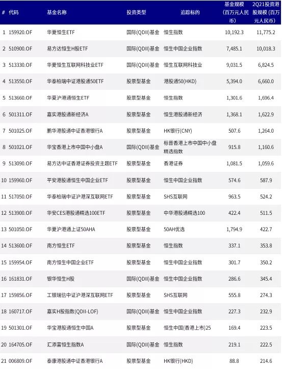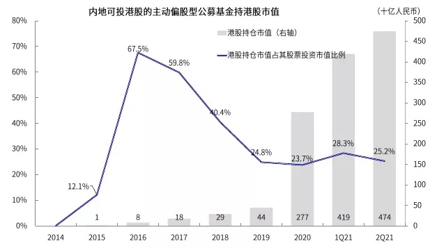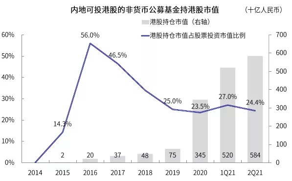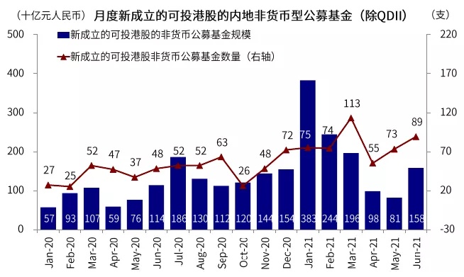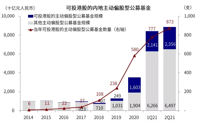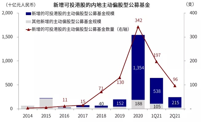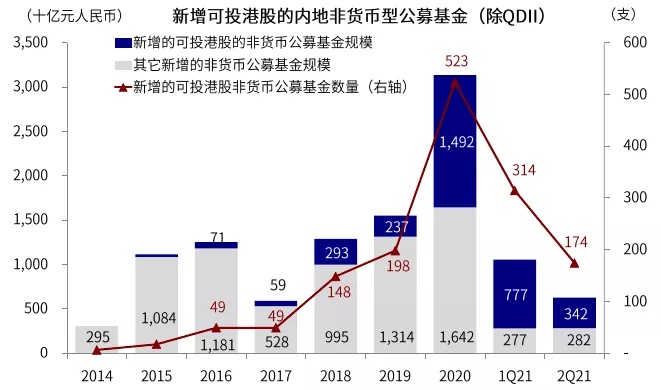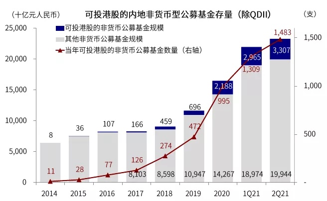 图表:截至2Q21,可投港股的内地非货币型公募基金数量达到1483支,基金总规模约为3.3万亿元