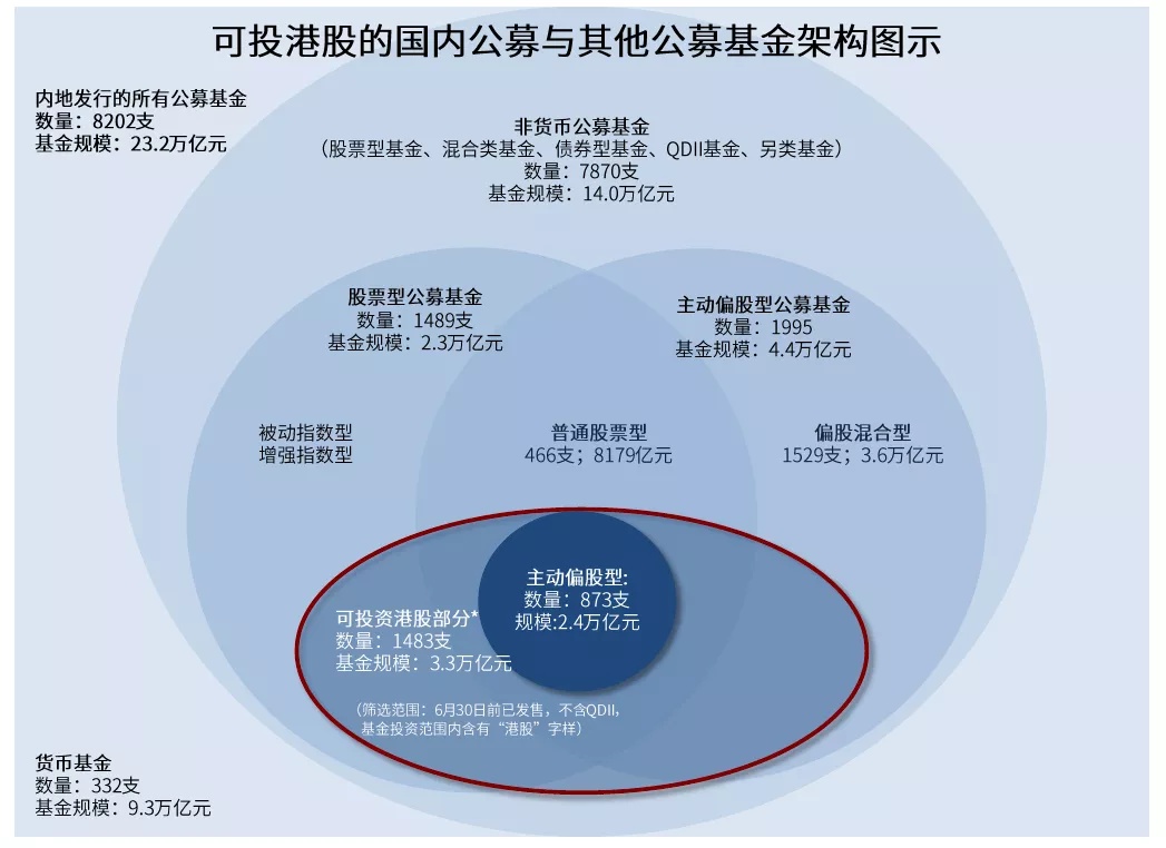 图表:截止二季末,可投港股的内地主动偏股型基金共873支,总规模2.4万亿人民币…
