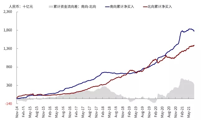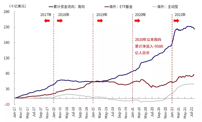 图表:沪深港通南向 vs. 海外资金主被动资金流入情况