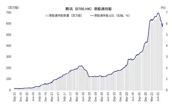 图表:腾讯南下持股在6月初达到6.96%的高点,目前回落至6.01%