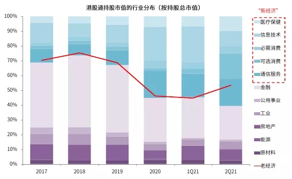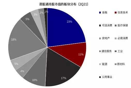 图表:二季度港股通持股市值最高的三个板块分别为金融、信息技术和可选消费,新经济占比60.7%