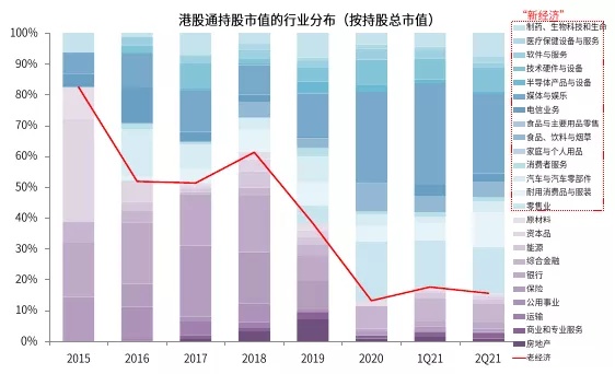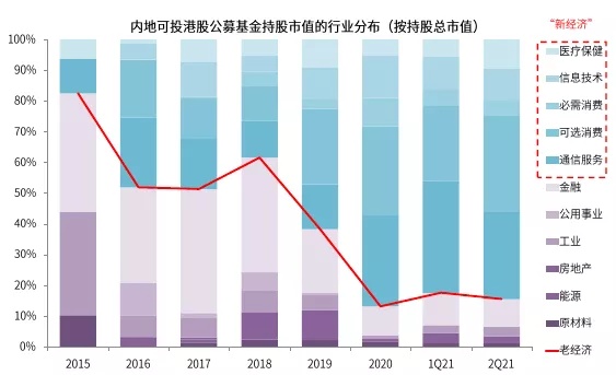 图表:新经济依然是整体内地公募基金配置港股的最主要偏好,整体占比依然高达84.5%