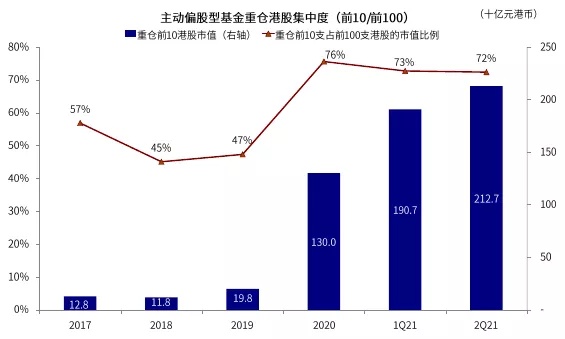 公募占比进一步提升:相比互联互通南向2.3万亿人民币的整体持股市值,二季度公募基金港股持仓占25.5%,较2020年底19.5%和一季末24.2%进一步提升,表明公募基金在南向投资中的角色进一步加强。