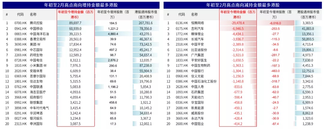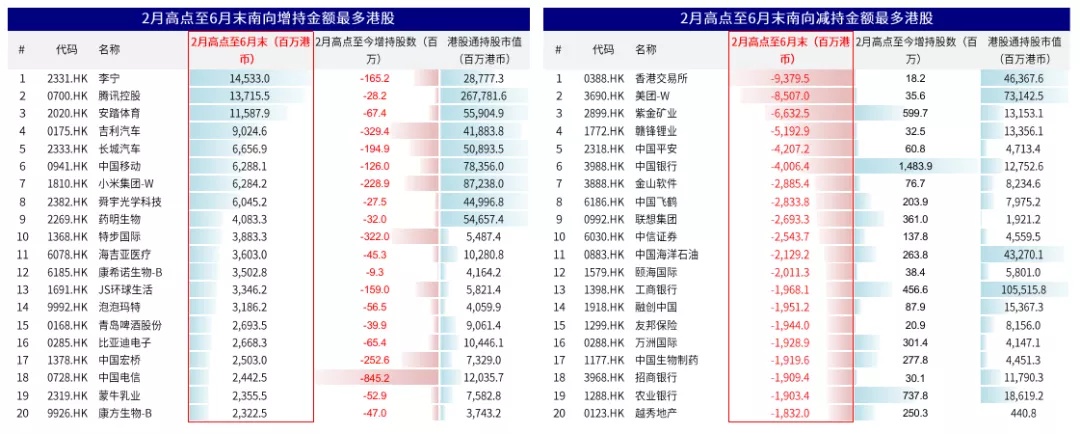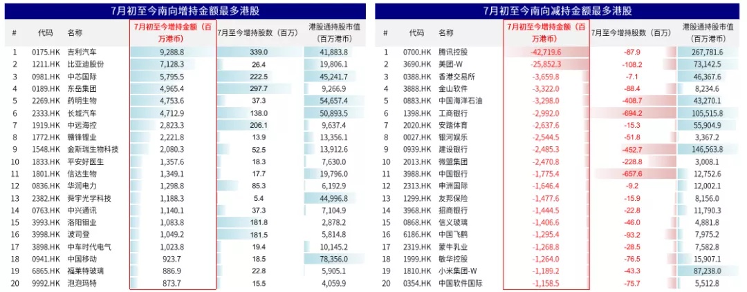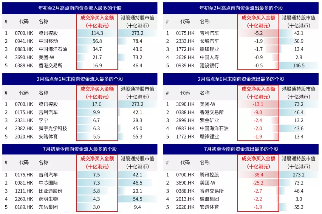 图表:年初至今、2月恒生指数高点至今以及7月至今南向增减持金额最高的个股列表