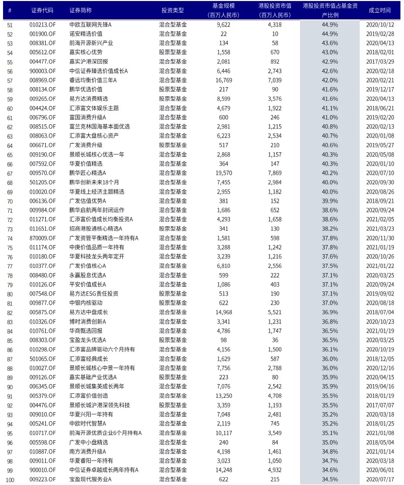 图表:港股持仓市值前100支大陆主动偏股型公募基金(1/2)