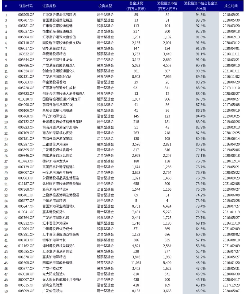在样本选择上,我们依然将不包含QDII基金而仅通过沪港通投资港股的非货币公募基金作为分析对象。具体来说,只要章程中约定,基金便可以通过沪深港通投资港股,投资比例不超过股票资产的50%;如果基金名称带有“港股”字样,那么其港股投资比例不得低于股票资产80%。
