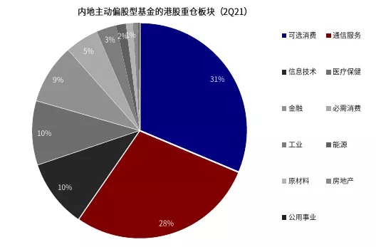 图表:与港股通持股不同,内地主动偏股型公募基金持股偏好可选消费、通信服务和信息技术