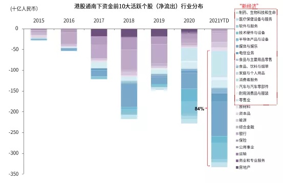 图表:基于前10大活跃个股,2021年南向资金主要卖出信息科技和可选消费板块