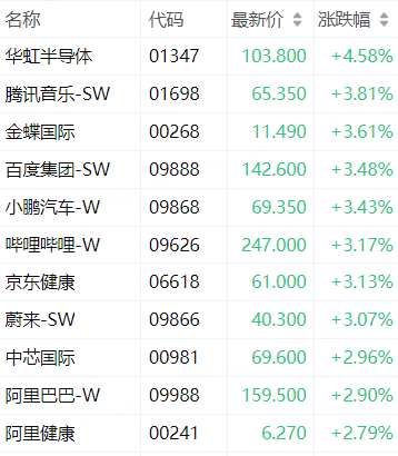 科指成分股中,华虹半导体涨4.58%,腾讯音乐-SW涨3.81%,金蝶国际涨3.61%,百度集团-SW涨3.48%,小鹏汽车-W涨3.43%。