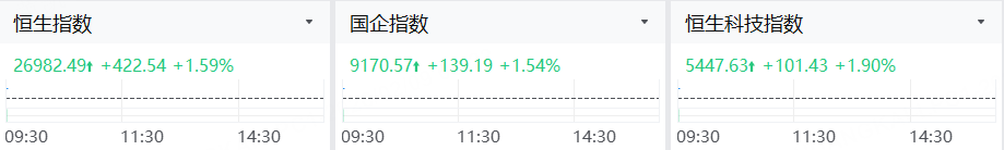 2月9日,港股三大指数高开,恒指涨1.59%,国指涨1.54%,恒生科技指数涨1.9%。