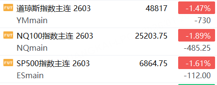 1月20日,美股三大股指期货齐跌,截止发稿,道指期货跌1.47%,纳指期货跌1.89%,标普500指数期货跌1.61%。