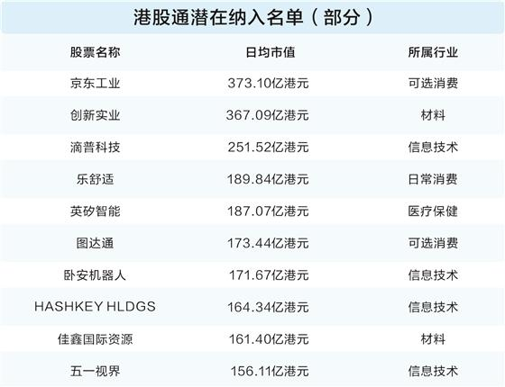 根据最新数据统计,共有43家公司符合港股通纳入标准,按日均市值排名,京东工业、创新实业、滴普科技、乐舒适、英矽智能、图达通、卧安机器人等市值排名居前。