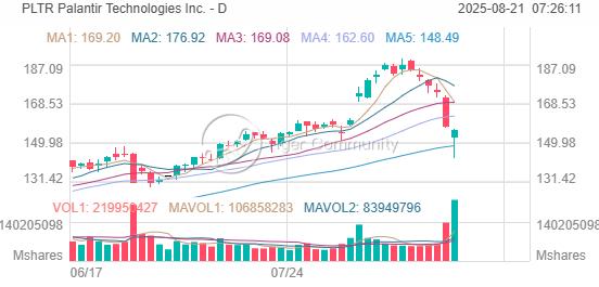 此次下跌创下了这家人工智能软件公司自2024年4月以来最长的连跌纪录,股价也已从近期盘中纪录高点下跌18%。截至周二收盘,Palantir股价已经累计较高点下跌15%,正式进入回调区间。
