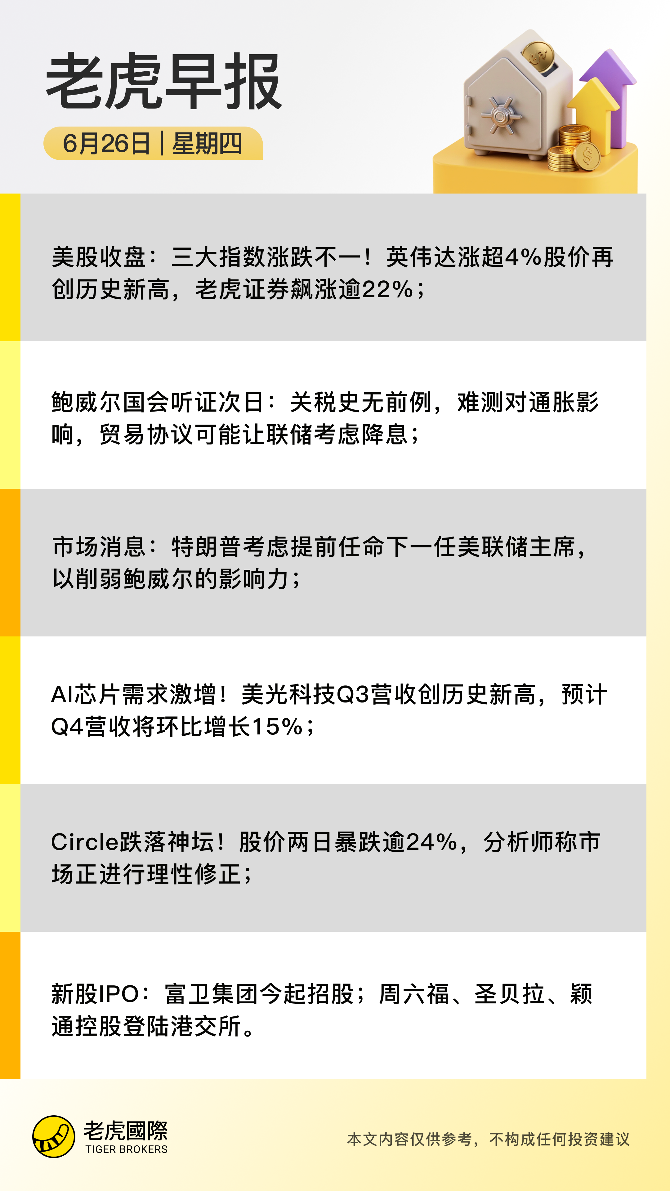 美股收盘:三大指数涨跌不一!英伟达涨超4%股价再创历史新高,老虎证券飙涨逾22%