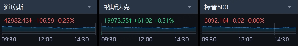 美东时间周三,美股三大指数涨跌不一,截至收盘,道指跌106.59点,跌幅为0.25%,报42982.43点;纳指涨61.02点,涨幅为0.31%,报19973.55点;标普500指数跌0.02点,报6092.16点。