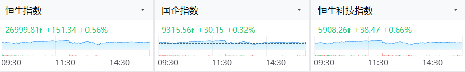 港股三大指数齐涨,恒生指数涨0.56%,恒生科技指数涨0.66%,国企指数涨0.32%。