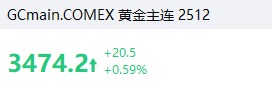金价涨0.59%,报3,474.2美元/盎司。