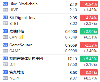 加密货币概念盘前多数走高,Bit Origin涨超10%,第九城市涨超8%,嘉楠科技涨超6%,GameSquare涨超3%,特朗普媒体科技集团、Bit Digital涨超2%。