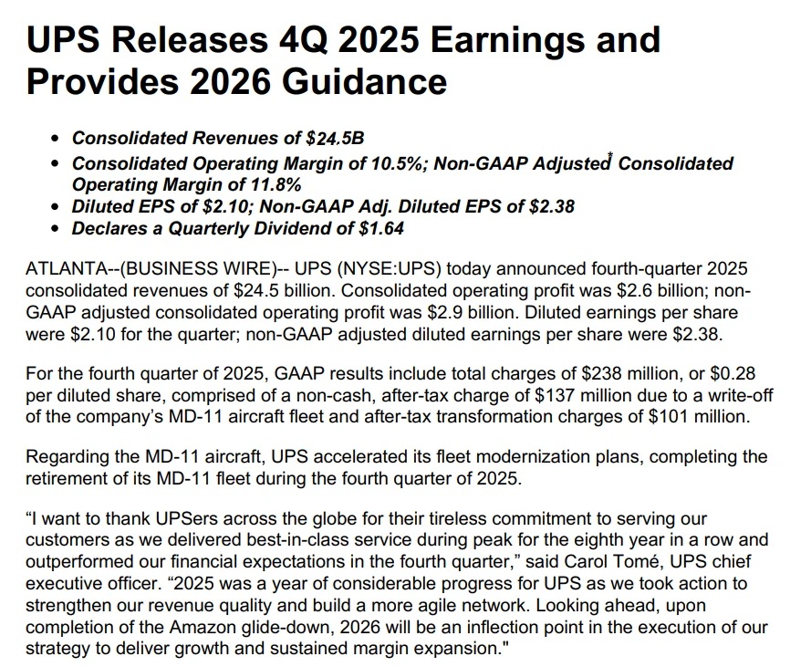 联合包裹第四季度营收245亿美元,调整后每股收益为2.38美元,均超市场预期。