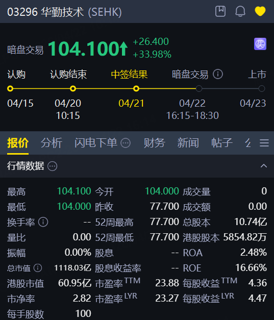 4月22日,华勤技术暗盘涨近34%,总市值超1118亿港元,每股定价77.7港元,每手100股;将于4月23日(周四)正式在港交所挂牌交易。