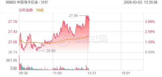 3月3日,石油股午后走高,中国石油股份涨超6%,中国海洋石油、中海油田服务涨超4%