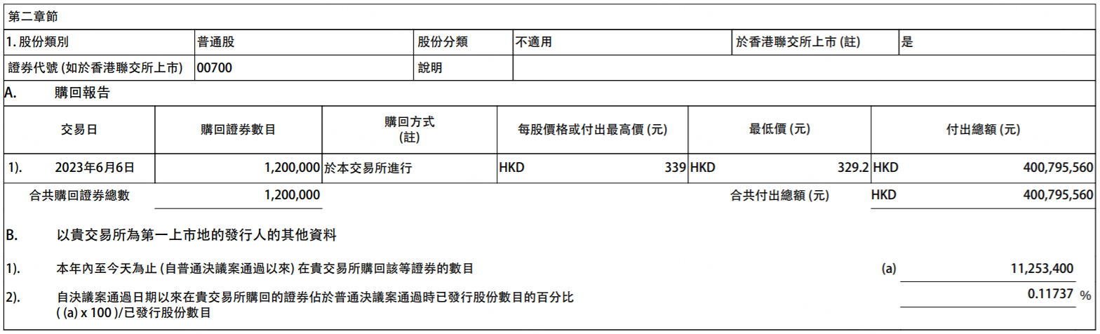 6月6日,腾讯控股发布公告,于2023年6月6日回购120万股,回购价格为329.2-339港元,共耗资约4亿港元。