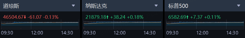 美东时间周四,美股三大指数收盘涨跌不一,盘中一度大幅下挫后收窄跌幅。截至收盘,道指跌61.07点,跌幅为0.13%,报46504.67点;纳指涨38.24点,涨幅为0.18%,报21879.18点;标普500指数涨7.37点,涨幅为0.11%,报6582.69点。