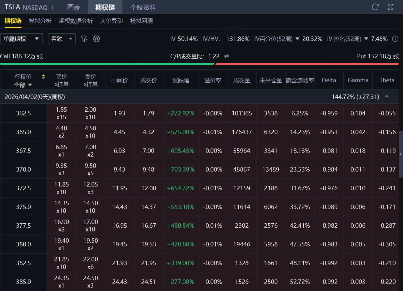 期权方面,特斯拉当日成交338.5万张,看涨期权占比55%,其中于4月2日到期的360美元行使价的看跌期权成交居前,成交近20万张。此外,从期权链上看,特斯拉多张Put单大涨,最高飙涨700%。