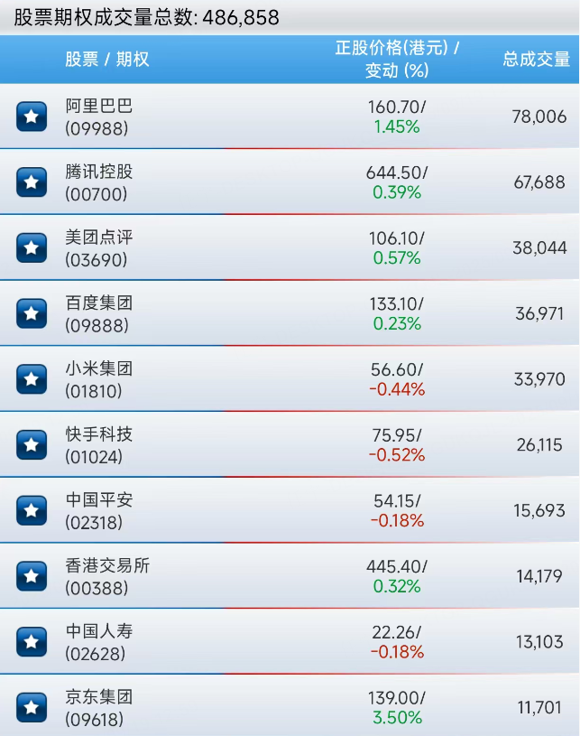 港股期权半日成交486858张。其中,阿里巴巴成交量位于榜首,达78006张。腾讯、美团、百度、小米、快手等主要科技股紧随其后。