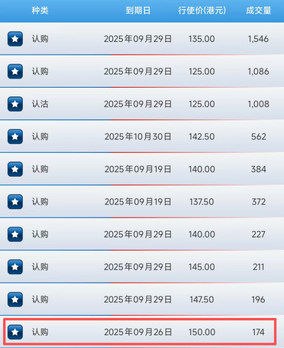 京东集团上午排名前十的合约中,九张都是认购合约。其中一张9月26日到期的CALL,行权价150港元,较现价有约7%的涨幅空间。