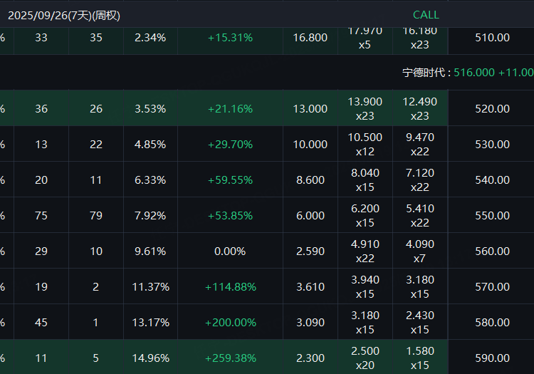 宁德时代下周到期的CALL已经出现了异动趋势,尽管目前成交量不大,但或许可以认为是一种信号。