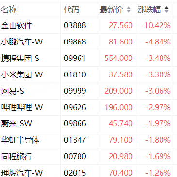 科指成分股中,金山软件跌超10%,小鹏汽车-W跌近5%,携程集团-S、网易-S跌超3%。