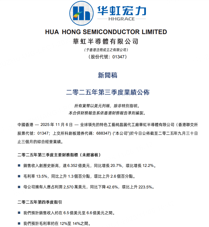 11月6日,华虹半导体港股公告,第三季度销售收入创历史新高,达6.352亿美元,同比增长20.7%,环比增长12.2%;母公司拥有人应占利润2570万美元,同比下降42.6%,环比上升223.5%。预计第四季度销售收入约在6.5亿美元至6.6亿美元之间;预计毛利率约在12%至14%之间。