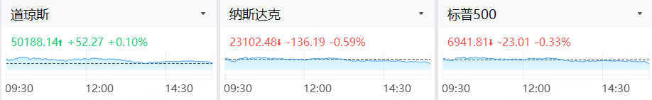 截至收盘,道琼斯指数涨0.10%,报50,188.14点;标普500指数跌0.33%,报6,941.81点;纳斯达克指数跌0.59%,报23,102.47点。