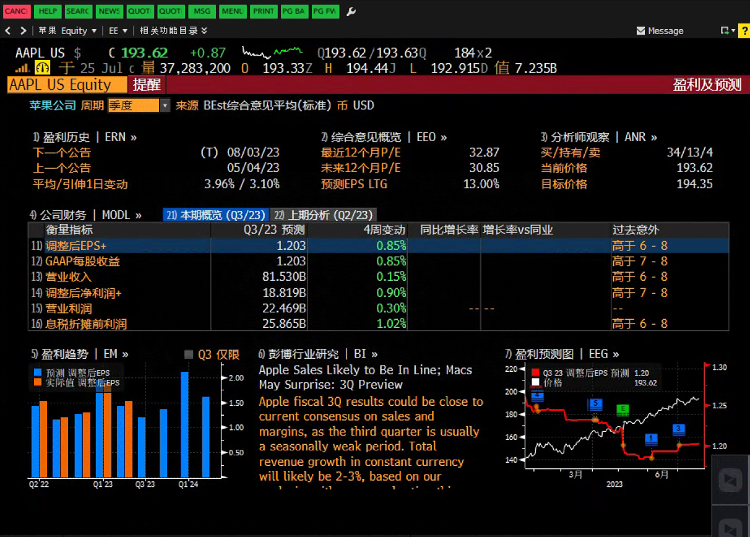 据彭博分析师一致性预期,苹果2023年第三财季营业收入约为815.83亿美元,调整后净利润188.19亿美元,料每股收益1.203美元。