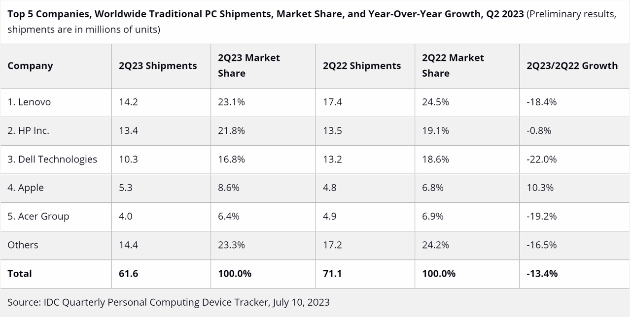 尽管行业出货量仍处于下滑趋势,但苹果的市场份额却出现逆势增长。苹果二季度发货量达到了680万台,市场份额从去年同期的6.4%扩大至11%,这主要归功于供应链问题的缓解,以及6月发布的新款搭载了M2芯片的MacBook Air带来的需求增长。