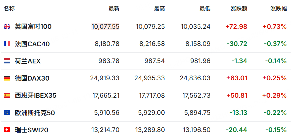 欧洲主要股指涨跌不一,截至发稿,英国富时100涨0.73%,法国CAC40跌0.37%,德国DAX30指数涨0.25%。