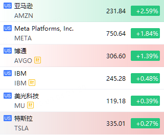 部分热门科技股上涨,博通、Meta涨超1%,亚马逊涨超2%;