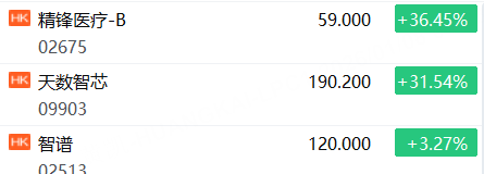 新股方面:智谱上市首日开涨超3%,天数智芯涨超31%,精锋医疗-B涨超36%。