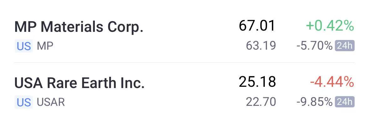 美股稀土概念股下挫,USA Rare Earth Inc.跌近10%,MP Materials Corp.跌近6%。路透社报道,特朗普政府正放弃此前为美国关键矿产项目提供最低价格保障的计划
