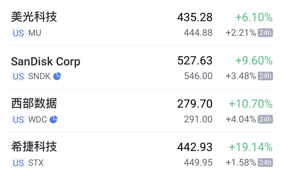存储概念股续涨,西部数据涨超4%,SanDisk涨超3%,美光科技涨超2%,希捷科技涨超1%。