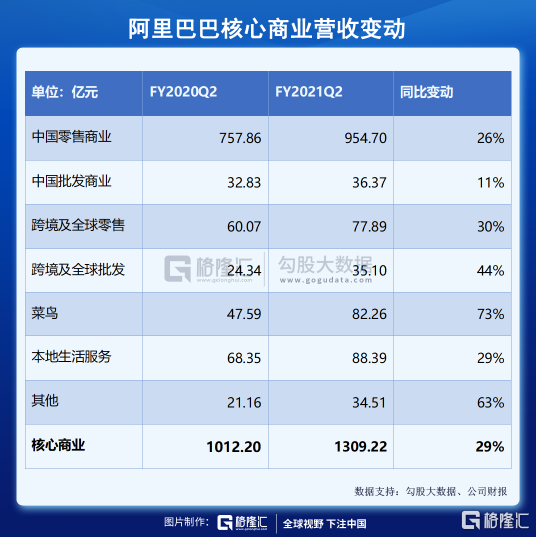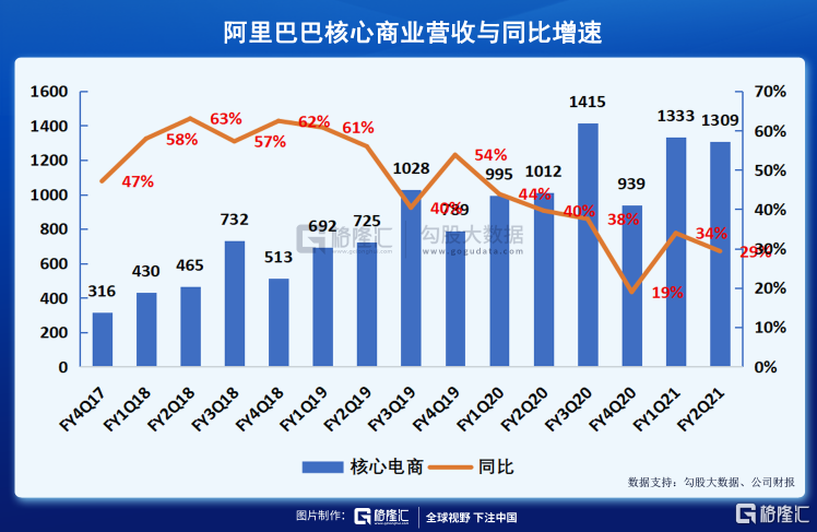FY2021Q2 阿里巴巴核心商业营收为1309.22亿元,同比增长29%。