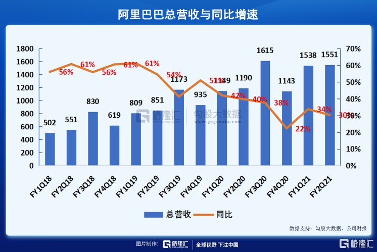 FY2021Q2,阿里巴巴实现营业收入1550.59亿元,同比增长30%,可以看到,阿里巴巴的营收增长仍然稳健,对于这样一个中国市值最大的上市公司而言,还能保持30%增速不是一件简单的事情。