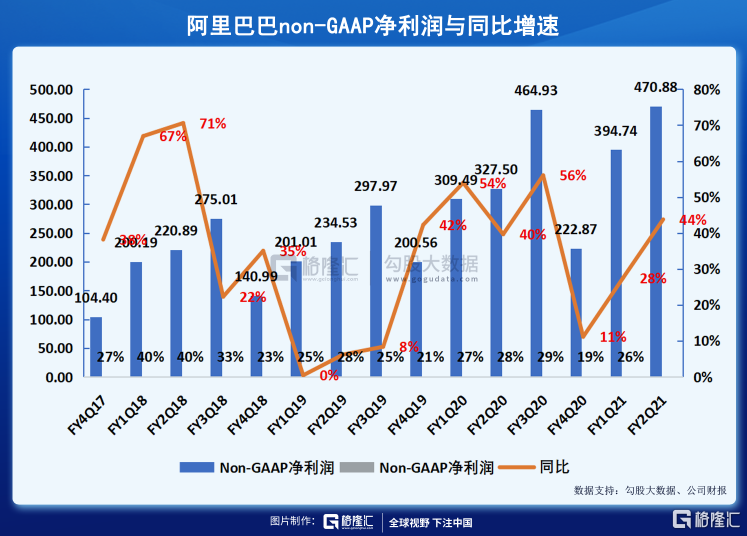 去年三季度,阿里巴巴集团在获得蚂蚁金服33%的股权后确认了一笔约692亿元的股权收益。因此导致这个季度的净利润相比于去年同期下降了63%,实际上,采用剔除该影响的Non-GAAP净利润,则FY2021Q2为470.88亿元,同比增长44%,增速较前两个季度继续回升,证明了阿里巴巴盈利能力改善明显。