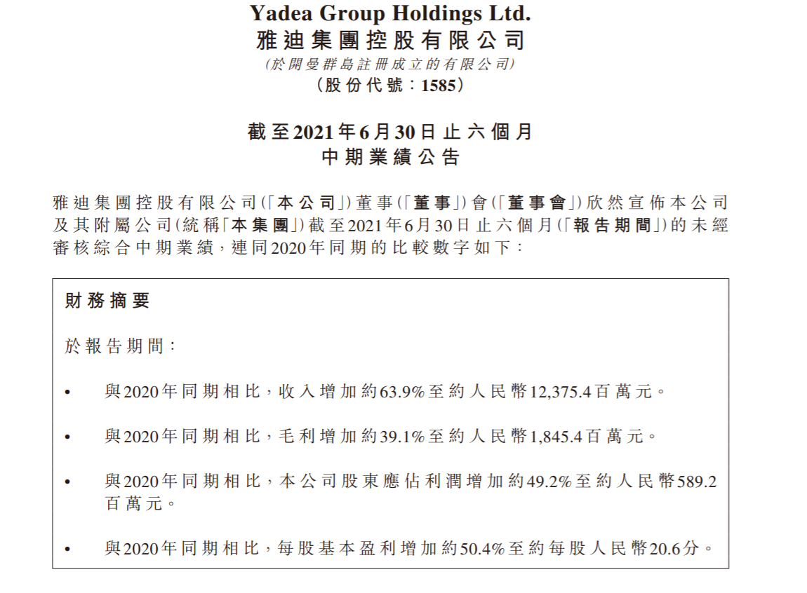 8月27日,雅迪控股发布公告,2021年上半年,公司收入123.75亿元人民币(单位下同),同比增长63.9%;股东应占利润5.89亿元,同比增长49.2%;基本每股收益20.6分。