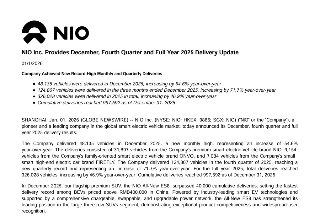2025年全年,蔚来公司共交付新车326028台,创历史新高,同比增长46.9%。