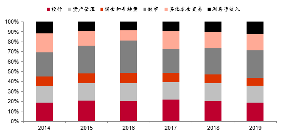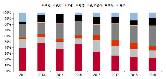 从我国券商的收入结构看,从2012年至2019年,经纪业务的平均收入的占比有明显下降,即从40%左右下降到20%左右,而自营收入的占比显著上升,说明券商的自有资本金规模在不断扩大。